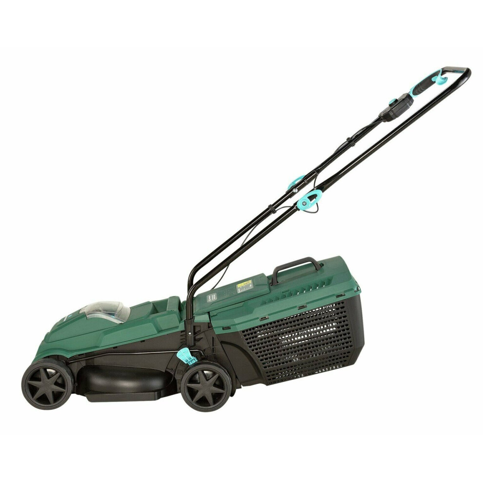 The McGregor 32cm Lithium-Ion cordless lawnmower includes a 21.6V, 4.0Ah battery.