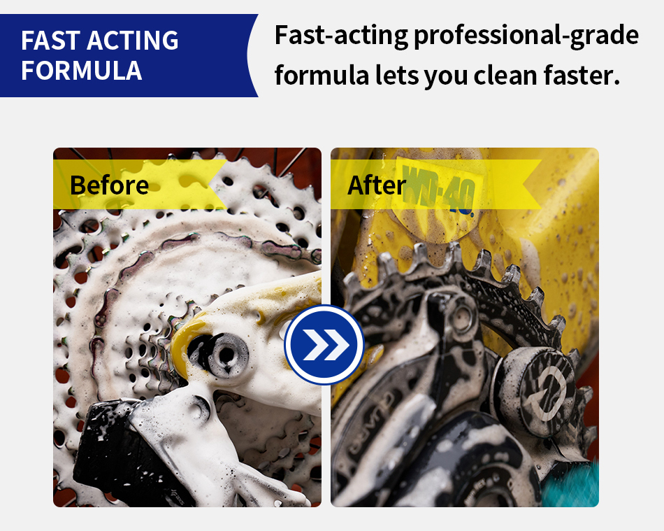WD-40 Specialist® Bike Degreaser foaming action clings to chain, cogs and gears to deeply penetrate and remove stubborn grease and grime from all moving parts. Experience the difference of a fast-acting professional grade formula that removes dirt, mud & grime.