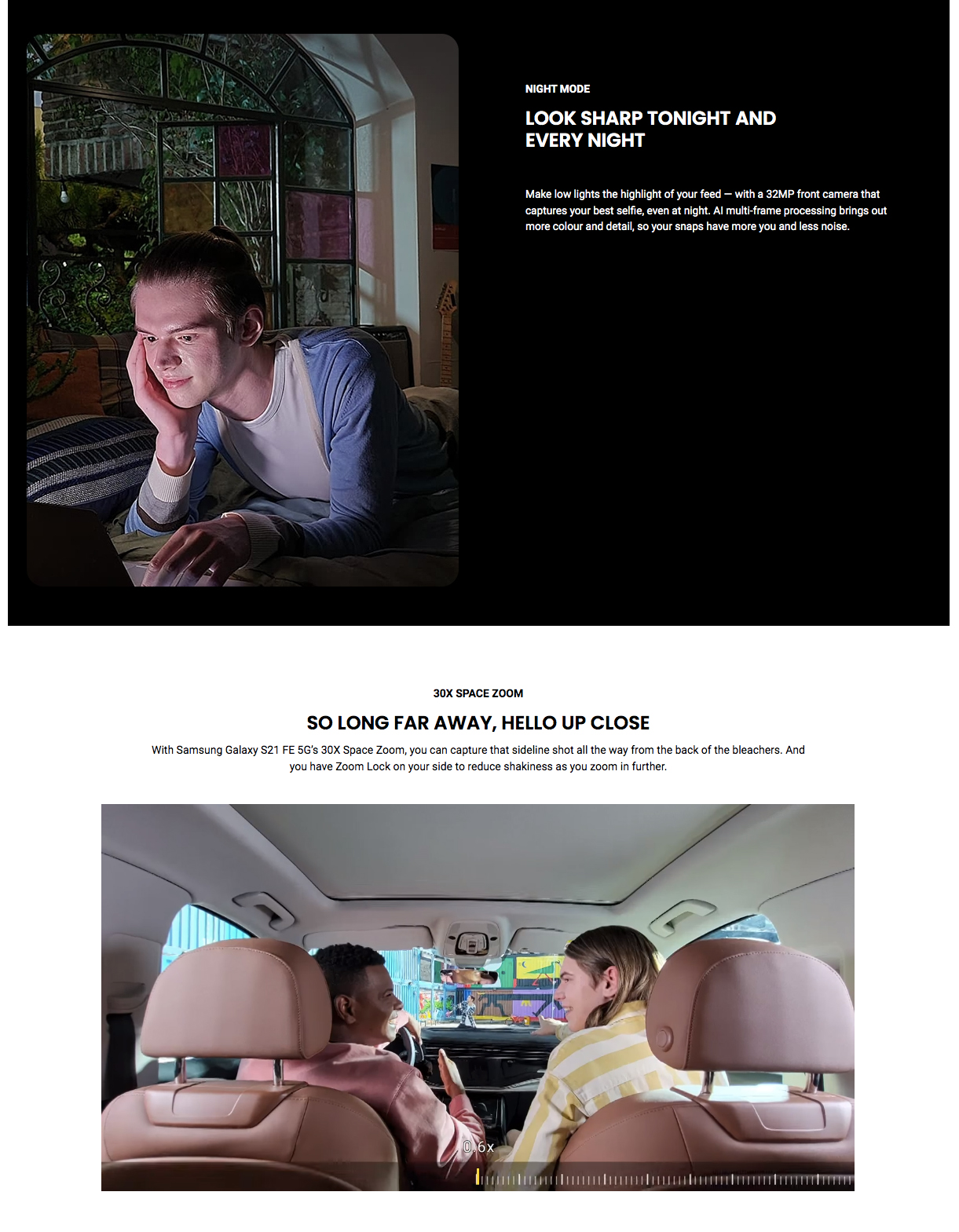 The Galaxy S21 is renowned for its industry-leading camera, and S21 FE 5G is equipped with the same pro-grade setup used to capture the world’s most vivid photos.