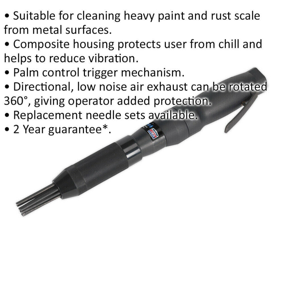 Suitable for cleaning heavy paint and rust scale from metal surfaces. Composite housing protects user from chill and helps to reduce vibration. Palm control trigger mechanism. Directional, low noise air exhaust can be rotated 360Â, giving operator added protection. Replacement needle set available.