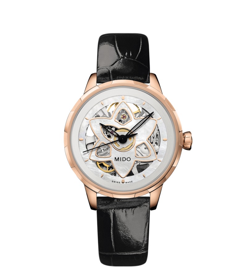 For the first time, Mido has created a skeleton Swiss watch especially dedicated to women. The new and audacious Rainflower Blossom features delicate lines, directly inspired by the lotus flower shape of Singapore’s contemporary ArtScience Museum. Resolutely feminine petals are interlaced along the edges. Adorned with an openwork flower, the captivating dial reveals at its centre the Caliber 80 – the latest-generation automatic movement, whose mainplate has been specially skeletonised and decorated. It invites the wearer to marvel at the passing of time with audacityand elegance.